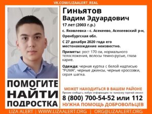 Ориентировка о поиске Вадима Гиньятова появилась накануне в Instagram-аккаунте поисково-спасательного отряда «Лиза Алерт». Информацию о пропавшем подростке сегодня опубликовали новостные порталы Ставрополья, Брянщины и других регионов страны. Поиски пока результатов не принесли. 27 декабря 2020 года около 06:00 Вадим покинул помещение пункта обогрева, расположенного в 17 метрах в северном направлении от железнодорожного полотна 1314...