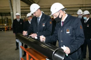 Денис Паслер с председателем совета директоров ПАО «ТМК» Дмитрием Пумпянским осмотрел три производственных участка: кузнечно-прессовый цех, производства газовых баллонов и обсадных труб...