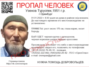 В областном центре полиция и волонтёры «ОренСпас» ищут пропавшего без вести Туруспека Узенова. 1 января в 08.30 семидесятилетний мужчина ушёл из дома в районе железнодорожного вокзала и до сих пор не вернулся. На связь с родными он не выходит. Особые приметы: рост около 175 см, глаза карие, борода. Пенсионер был одет в чёрную куртку...