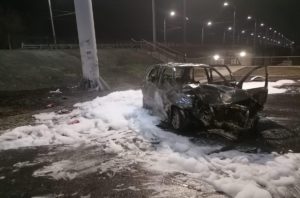 В Оренбурге LADA Kalina врезалась в опору рекламного щита и загорелась