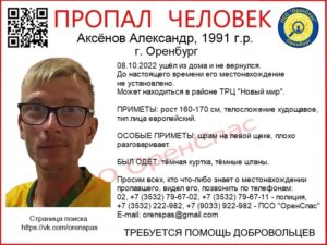 В октябре 2022 года житель Оренбурга пропал без вести. До сих пор Александра Аксёнова не нашли. Александр Аксенов ушёл из дома в областном центре 8 октября 2022 года. Предполагалось, что 31-летний мужчина может находиться в районе улицы Салмышской и проспекта Победы, 144 в общежитии «Аист», так как он посещал его ранее. Приметы: рост 160-170 см,...