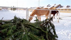 На оренбургском ипподроме новогодними ёлками кормят лошадей