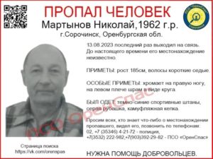 Полиция и волонтёры устанавливают местонахождение без вести пропавшего жителя Сорочинска Николая Мартынова 1962 года рождения. Мужчина последний раз выходил на связь 13 августа. Поисковики Сорочинского отделения ПСО «ОренСпас» обследовали возможное место пропажи. Осмотрели лесополосы, полевую зону и заброшенные здания. Обнаружить пропавшего не удалось. Его поиски продолжатся....