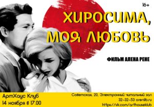 14 ноября в АртХаус Клубе Оренбургской областной библиотеки имени Крупской состоится показ и обсуждение драмы «Хиросима, моя любовь». Фильм классика французского кино Алена Рене вышел на экраны в 1959 году. Главные роли исполнили француженка Эмманюэль Рива и японский актёр Эйдзи Окада. Сюжет основан на любви французской киноактрисы и японского архитектора в послевоенной Хиросиме. На...