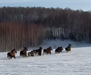 Жительница Тюльганского района Елена Шустикова поделилась в соцсети видео, на котором стадо из семи лосей движется через заснеженное поле в сторону леса. С наступлением весны самцы уже скинули свои рога, и их теперь почти не отличить от самок. Следы трёх лосей несколькими днями ранее заметил сотрудник Оренбургского заповедника на участке «Буртинская степь» в черноольшанике...