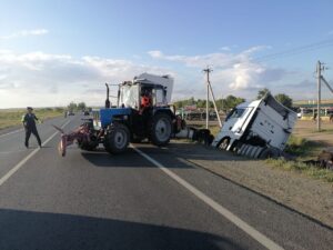 ДТП произошло на 66-м километре автодороги «Оренбург – Акбулак» в Соль-Илецком городском округе. Водитель большегруза, направлявшийся из Москвы в Узбекистан, не справился с управлением и выехал на встречную полосу, после чего фура съехала в кювет. Попытки выехать из глубокой канавы результатов не принесли. Прибывшие на место происшествия сотрудники ДПС вызвали трактор, который вытащил тягач...