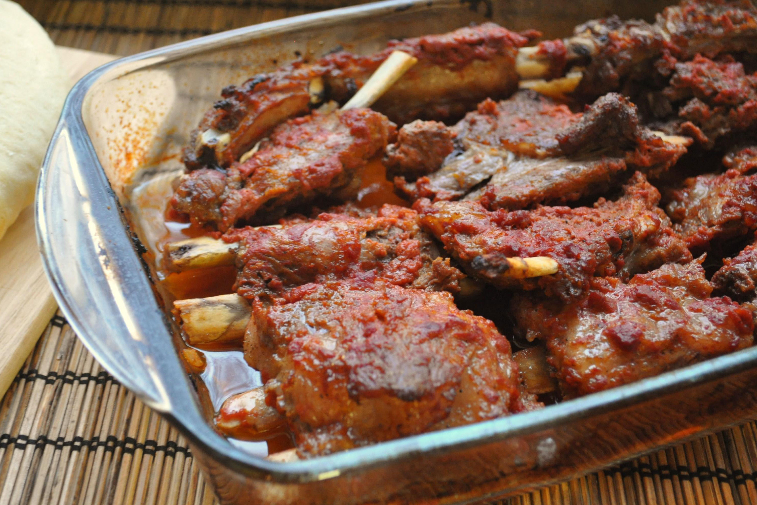 Ребрышки запечь на гриле или в духовке. В духовом шкафу их нужно готовить при температуре 150-180 градусов не менее полутора часов, накрыв форму фольгой. По истечении этого времени фольгу удалить, увеличить огонь и запекать еще минут 30 до золотистого цвета, периодически поливая выделившимся мясным соком.