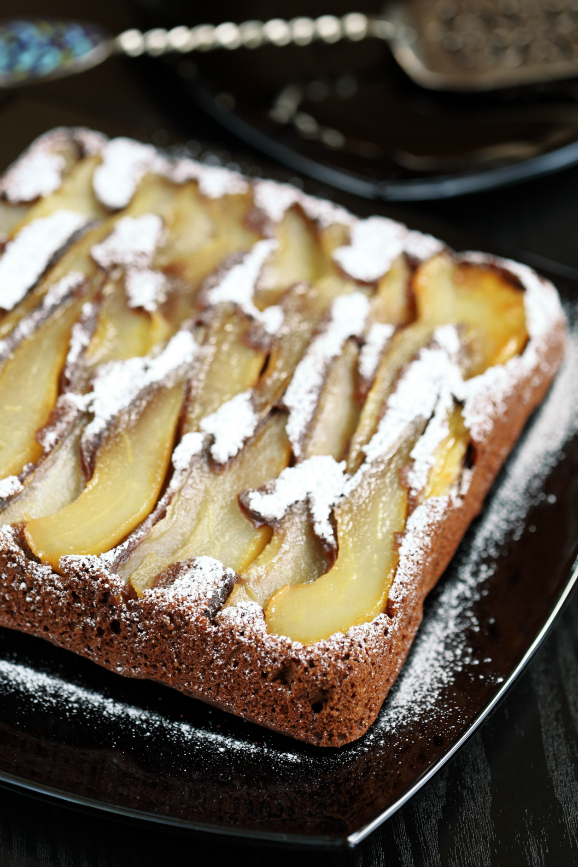 4. Груши выложить слоем и равномерно засыпать их кусочками шоколада.