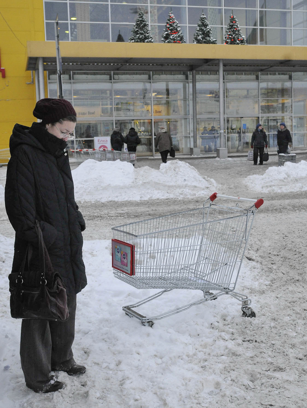 Эти фотографии – суета вокруг праздника. НО. Вот кто-то грустит возле пустой тележки из гипермаркета. Вот Дед Мороз хочет накормить бездомного пса по дороге «на работу». В этой лихорадке, в этом радужном блеске всегда чувствуется нотка печали, тревоги, одиночества.