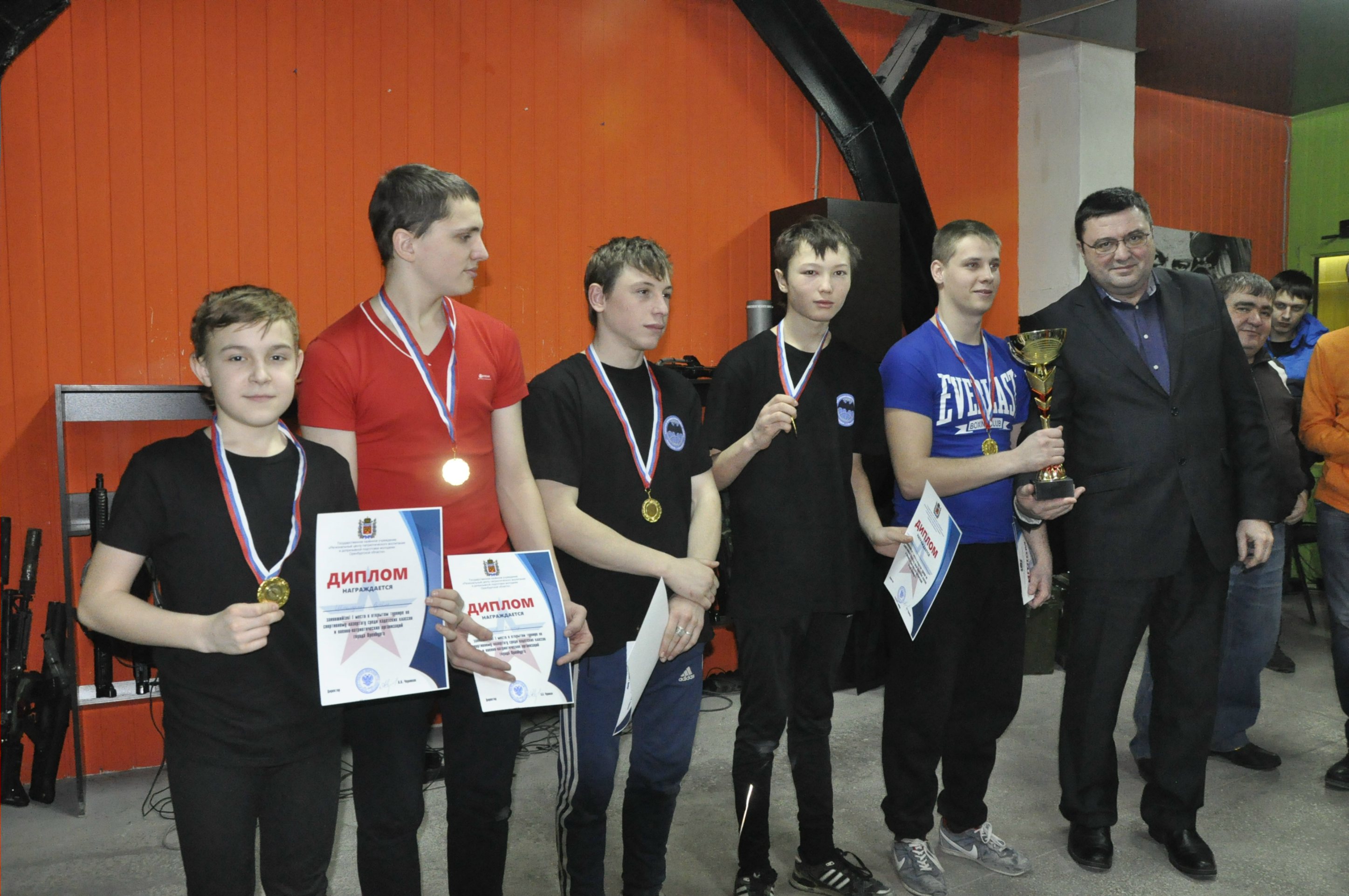На фото: Победители первенства Оренбурга по спортивному лазертагу команда «Разведчики» Центра патриотического воспитания допризывной молодёжи. Грамоты вручает Александр Черников