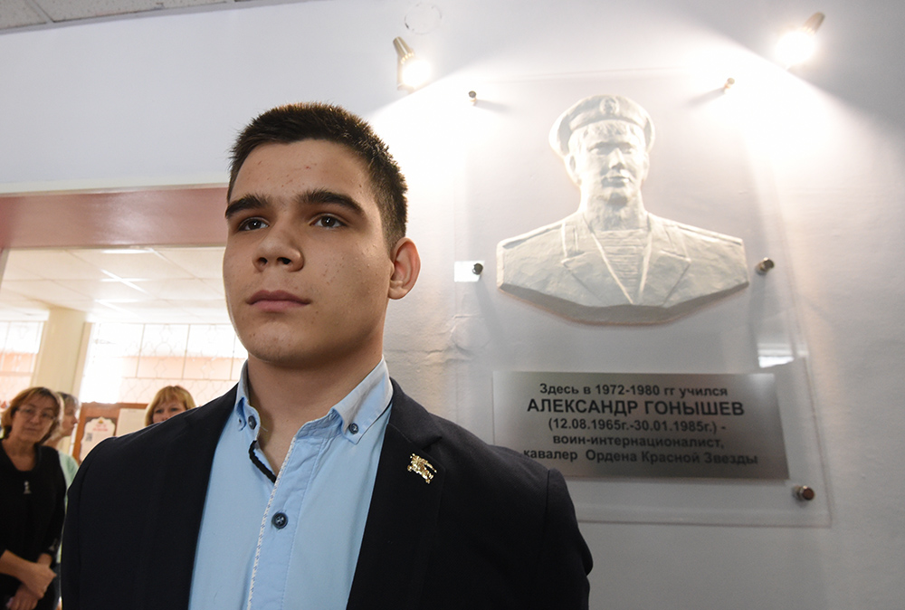 Барельеф кавалера ордена Красной Звезды Александра Гонышева, простого деревенского парня, имя которого так и не привыкли сопровождать отчеством, – у входа в школу. Гипсовое лицо десантника подсвечивается с двух сторон лампами, тут же цветы. Годы жизни: 1965 – 1985.