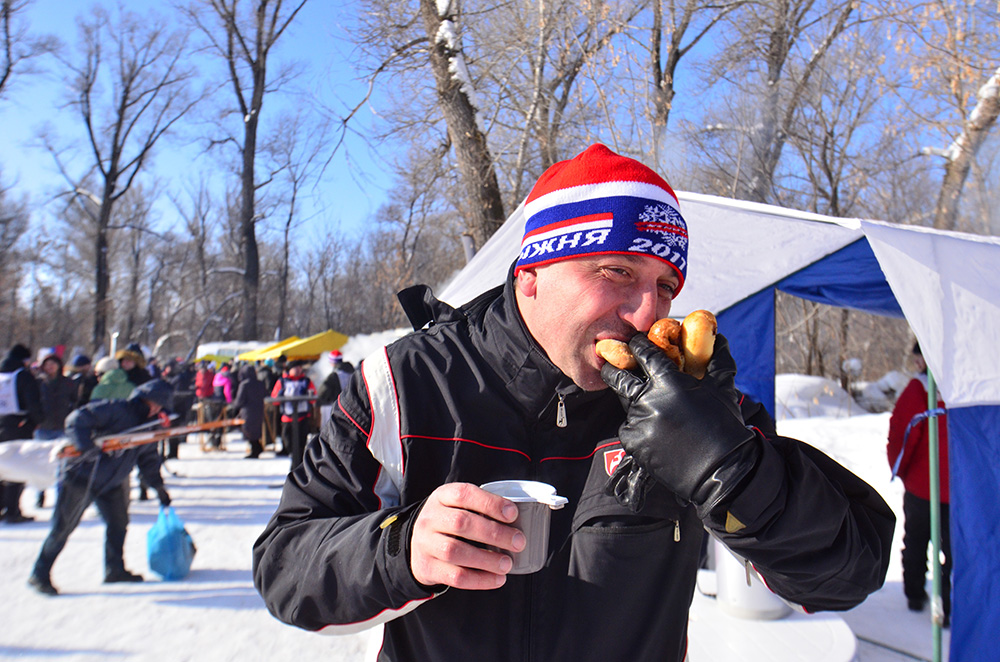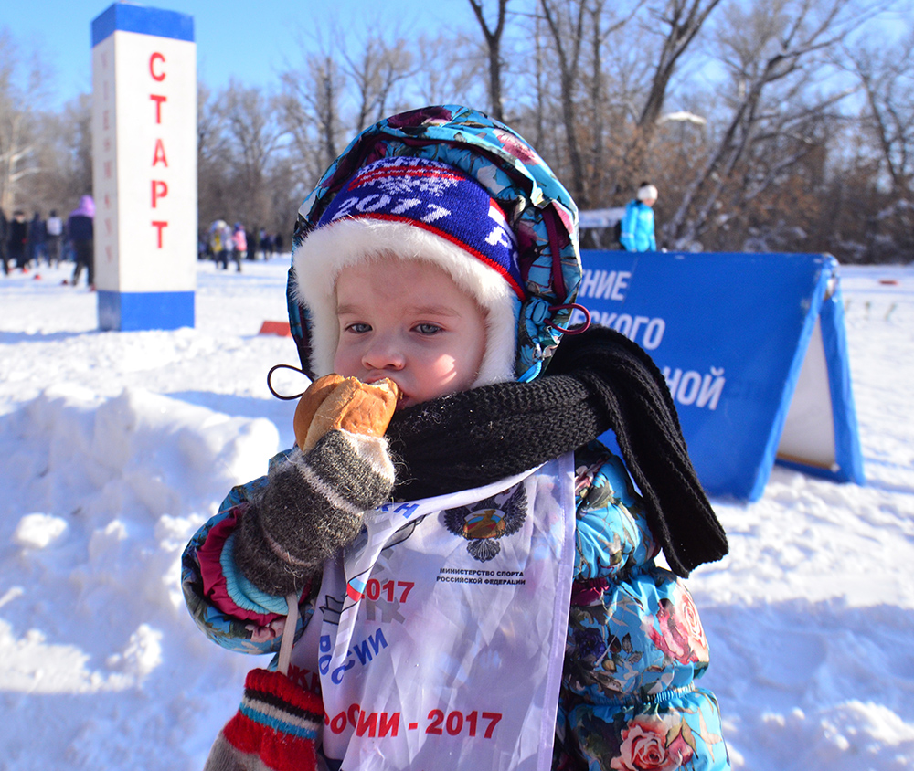 И вот село Нежинка Оренбургского района. Трехлетняя Мирослава степенно откусывает по кусочку от пирожка с капустой. На лыжи не встала по младости лет, но вместе со всеми радуется лыжному духу!
