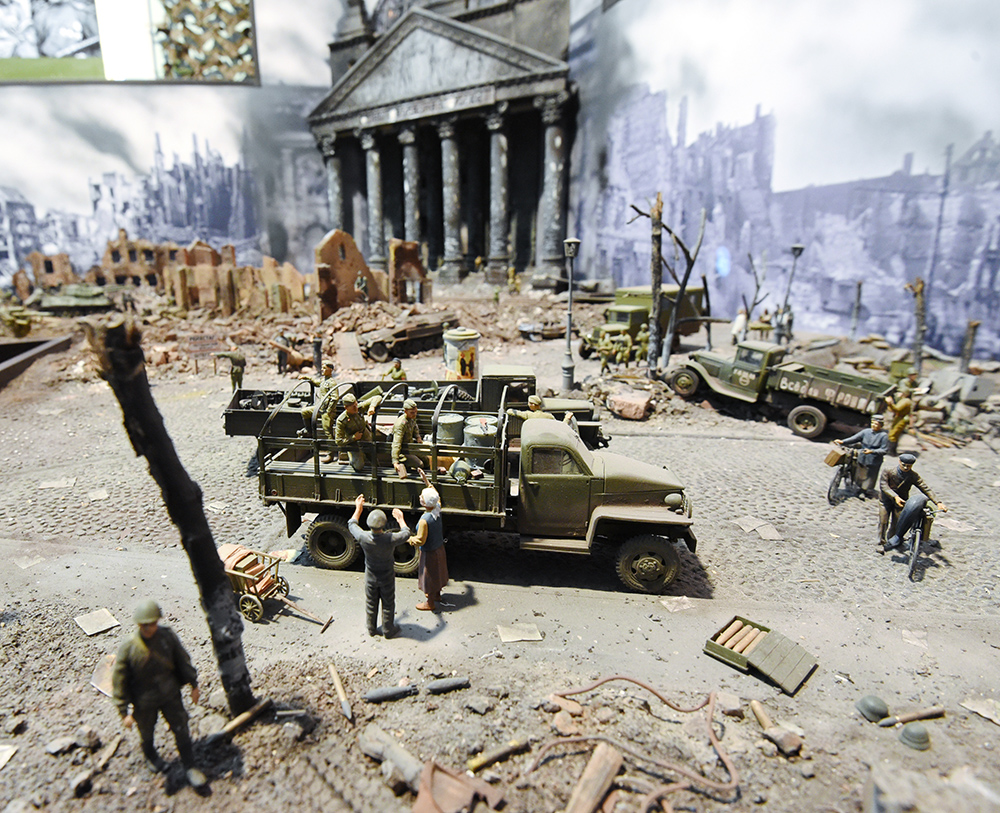 В углу стоит большой макет побеждённого Рейхстага. Панорама 1945 года. Каждая из 143 крошечных фигурок достоверна до мельчайших деталей. Ребята из клуба моделистов, которые сделали это чудо, работали над проектом больше года. Лица, медали, погоны людей изготавливали по оригинальным фотографиям. И если там, перед Рейхстагом, в 1945 году стоял танк с решётками на броне, то на макете он тоже есть. Фонарь наклонён, фашиста бойцы достают из канализационного люка, зенитка смотрит дулом в небо. И даже надписи на Рейхстаге все достоверные.