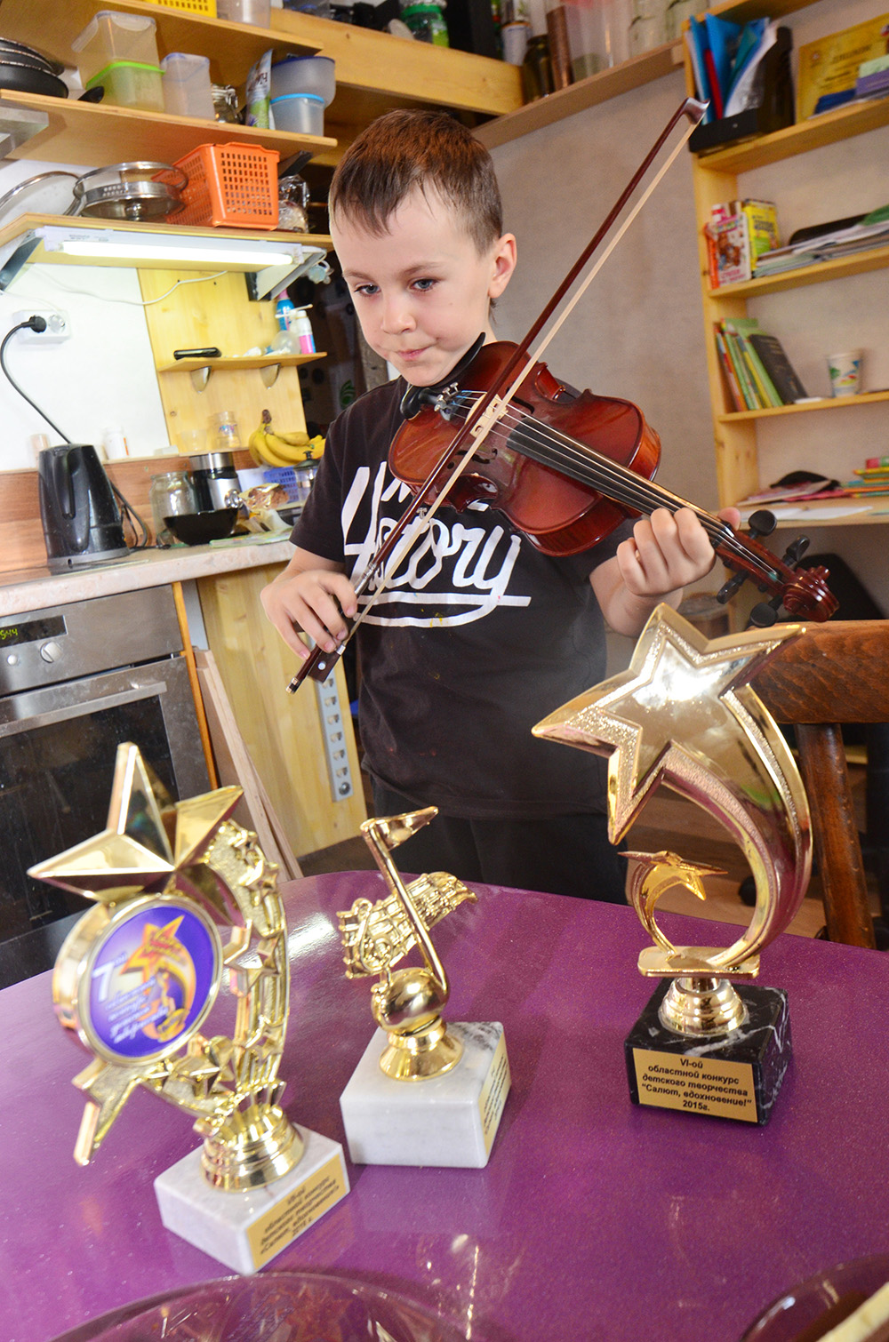 Пока мы беседуем, в комнату то и дело заглядывают дети. Вот со скрипкой заходит Андрей. Исполнив разучиваемую для конкурса композицию Зейца, харизматично заявит: «Я сейчас отвратительно сыграл!..»