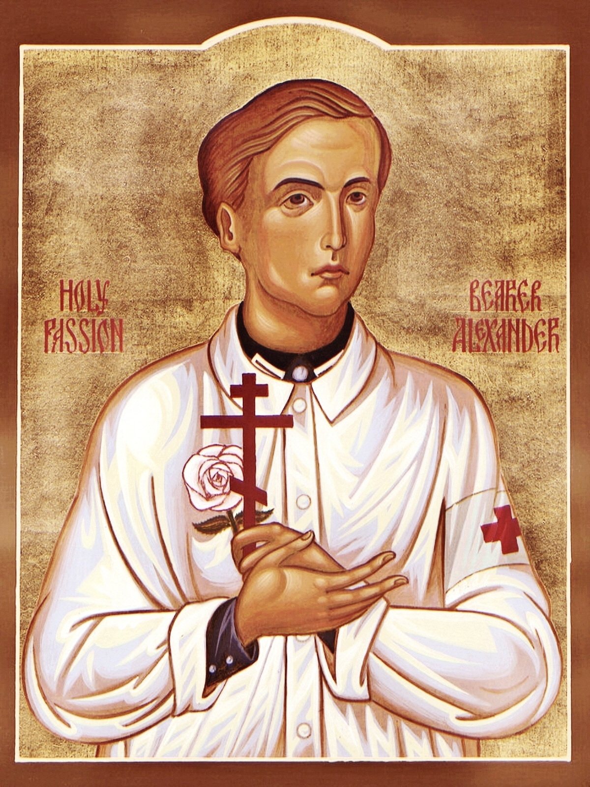 С одной стороны – портрет Шмореля–антифашиста, с другой стороны – икона святого, соответственно, внизу с одной стороны указано его имя, с другой – «Св. Александр Мюнхенский». Шесть роз символизируют казнённых участников группы «Белая роза».