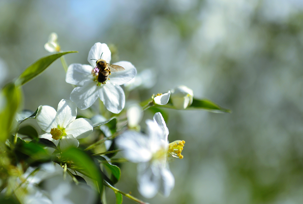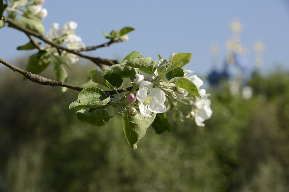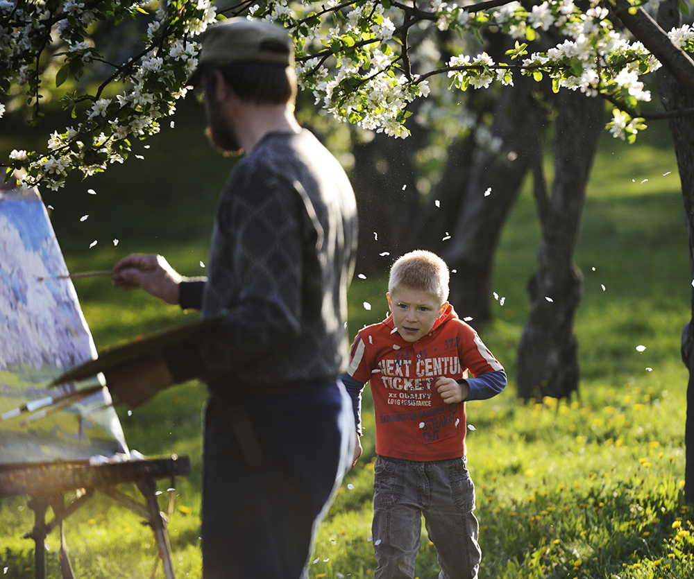 Посреди белых шапок яблоневого цвета стоит неизвестный мне художник.