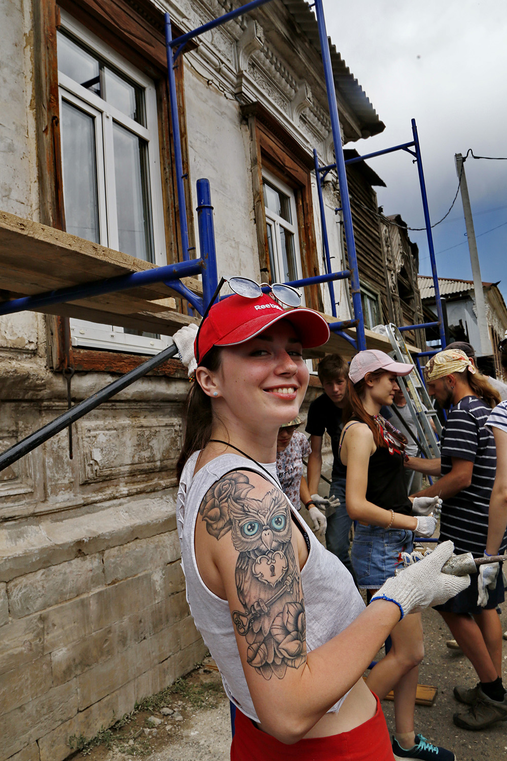 Хозяева обветшавшего особняка, скромные оренбуржцы, помогают волонтёрам. Подносят инструменты, воду, показывают любопытствующим внутреннее убранство комнат с лепниной на потолках.