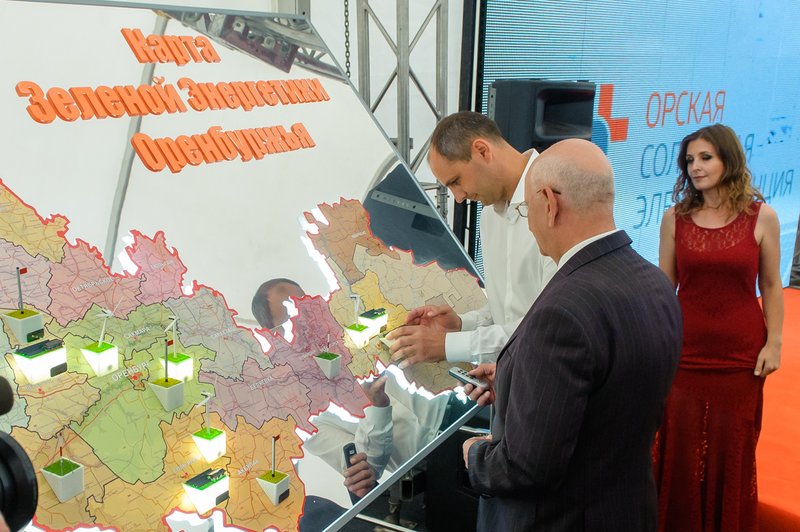 На торжественном открытии новых очередей для наглядности установили символичную панель с картой Оренбуржья, где обозначены все объекты «зелёной» энергетики нашего региона. Губернатор Юрий Берг и председатель правления группы «Т Плюс» Денис Паслер под аплодисменты отметили на карте в точке Орской СЭС запуск дополнительных мощностей.