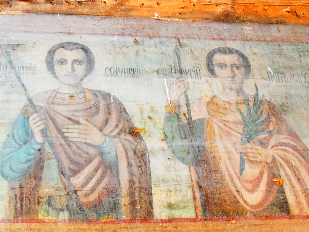 Внутри храма сохранились удивительные фрески. Нанесенные на дерево краски побледнели, выцвели, но изображения еще видны. Причем в них угадывается работа как минимум двух иконописцев. Некоторые образа явно принадлежат кисти профессионала, а некоторые – наивные, с заметно искаженными пропорциями, – очевидно, писал кто-то из местных художников-самородков.