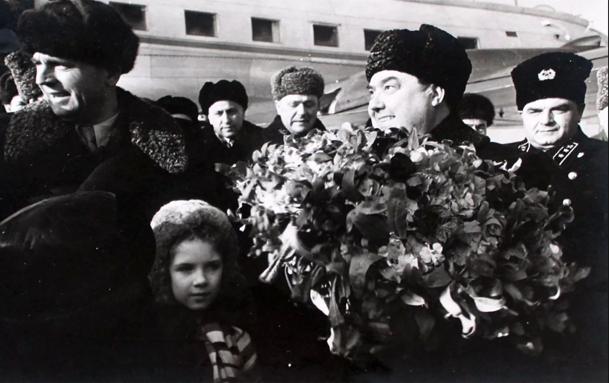 Для кинохроники здание драмтеатра, где проходило торжество, пожарные облили водой, она замёрзла, и театр сиял, как дворец. Краевед Иван Коннов нашёл любопытную фотографию. После торжественной части был концерт. А потом оба довольных вождя снялись с большим сводным хором, который объединил многих, в том числе и курсантов. Маленков и Полянский внизу, в центре. За ними стеной – хор. Коннов утверждает: в верхнем ряду седьмой справа курсант Оренбургского лётного училища Юрий Гагарин.