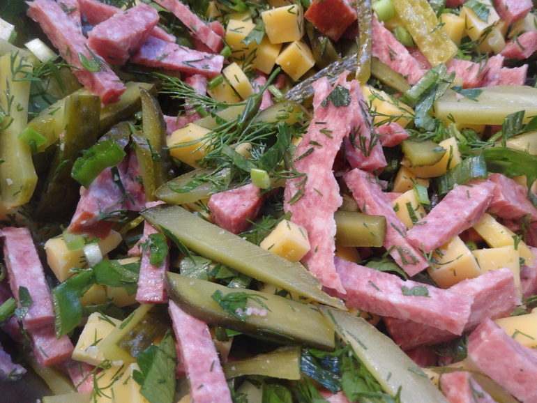 Огурцы и колбасу нарезать тонкой соломкой, сыр и лук – мелкими кубиками. Мелко нарезать зелень. В глубокой посуде всё перемешать.