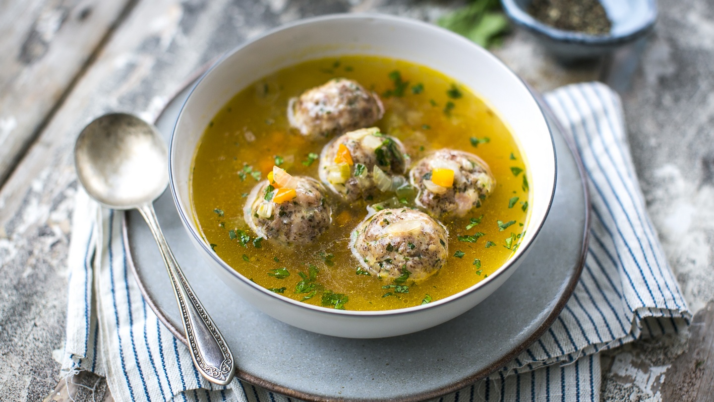 Ингредиенты: мясной бульон, картофель, морковь, лук репчатый, масло подсолнечное, яйцо, мука, вода, соль.
