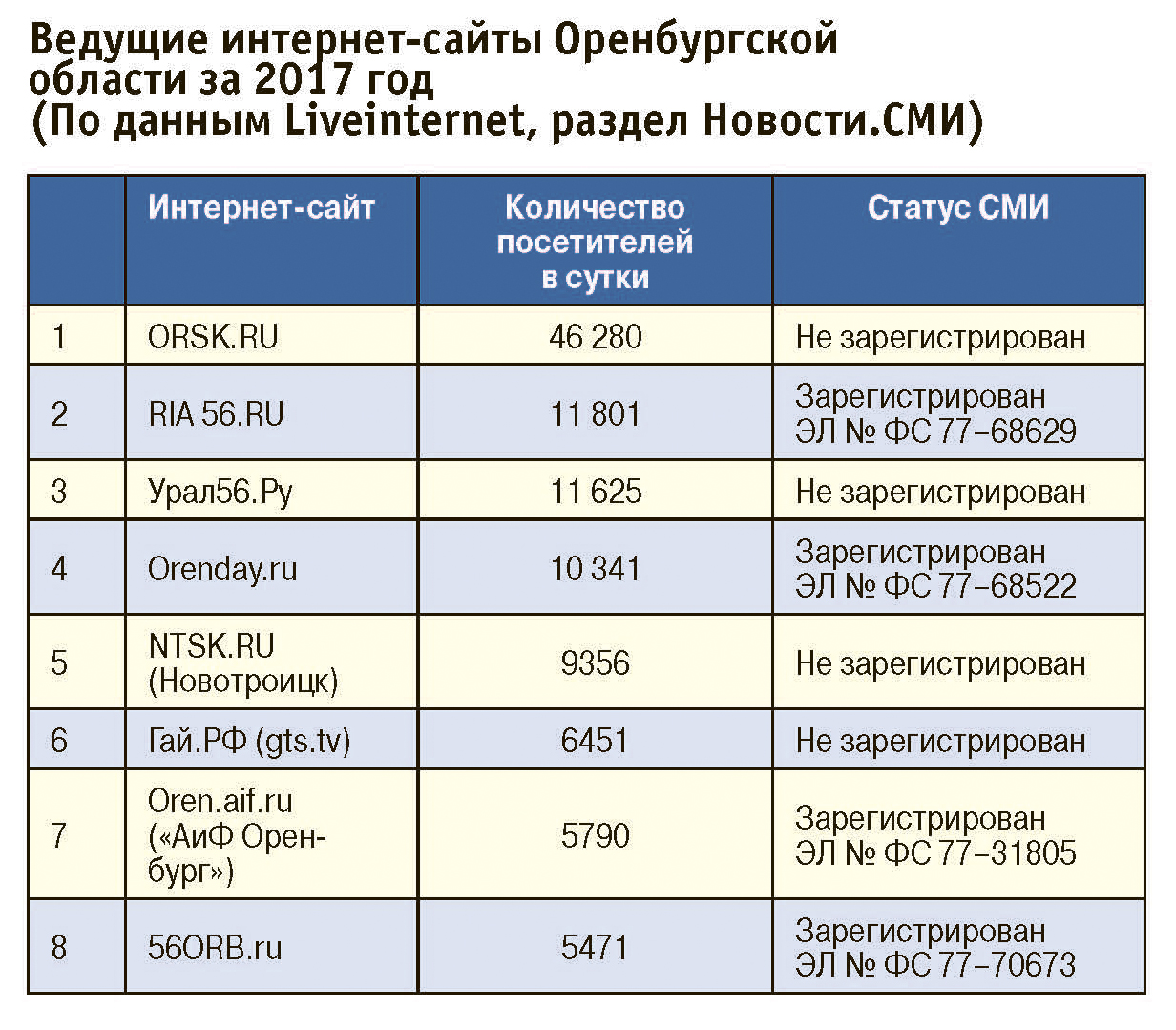 Здесь за год у нас произошли изменения. Безусловным лидером, как и много лет подряд, остаётся портал РИА56. Серьёзно прибавили в 2017 году «ЭХО Москвы в Оренбурге», «МК» и газета «Оренбуржье». В целом за Интернетом будущее, правда, с профессиональной точки зрения, интернет-новости – это упрощённые газеты и телевидение в традиционном смысле.