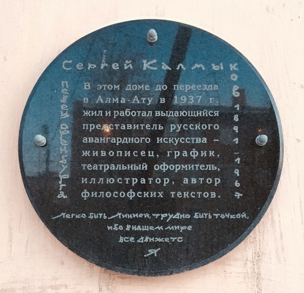 «В этом доме до переезда в Алма-Ату жил и работал выдающийся представитель русского авангардного искусства – живописец, график, театральный оформитель, иллюстратор, автор философских текстов Сергей Калмыков – певец Оренбурга (1891 – 1967). Легко быть линией, трудно быть точкой, ибо в нашем мире все движется».