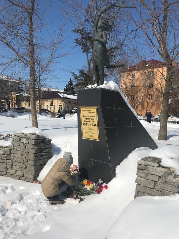 Этот памятник посвящён сотрудникам Центрального Справочного Бюро, помогавшим в годы Великой Отечественной войны найти друг друга людям, разлучённым войной.