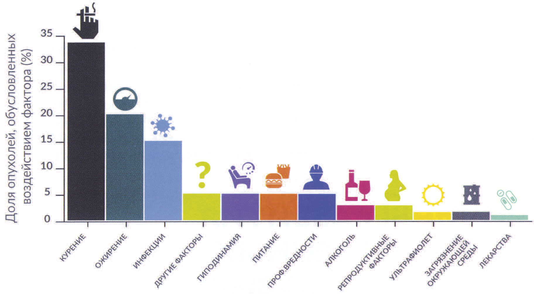 К сожалению, развитие не всех видов опухолей может быть предотвращено. Более половины из них возникают спонтанно, и причины до сих пор неизвестны (смотрите инфографику № 1). Либо вызываются такими канцерогенами, от которых невозможно защититься: например, продуктами гниения, образующимися в процессе разложения белковых остатков пищи в толстой кишке или при контакте с радиацией. Кроме этого существует ряд наследственных заболеваний, увеличивающих риск развития злокачественных опухолей.