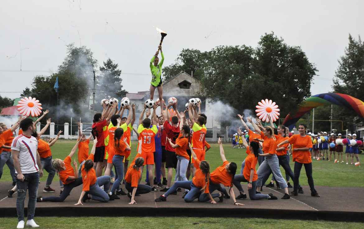 Символический огонь соревнований, переданный почётным гостем игр – олимпийским чемпионом Павлом Сукосяном капитану женской волейбольной сборной Соль-Илецкого городского округа Кристине Дорофеевой, запылал в чаше стадиона.