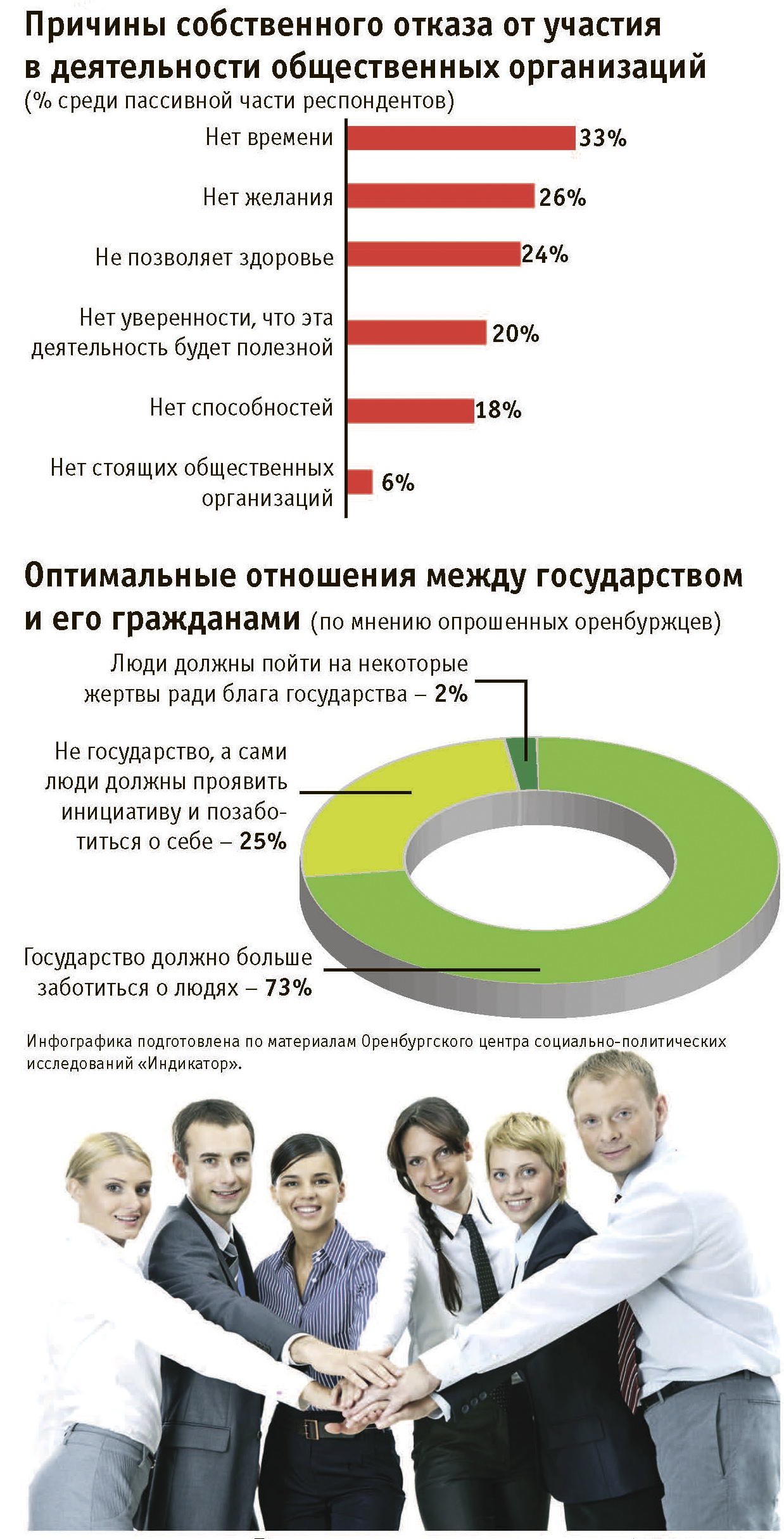 Откуда же корни социальной пассивности и активности? По данным исследований оренбургских социологов, активизируясь на выборах, в остальное время многие самоустраняются от общественных процессов. В такие формы коллективных действий, как субботники, охрана порядка, культурно-спортивные мероприятия, вовлечено не более трети жителей.