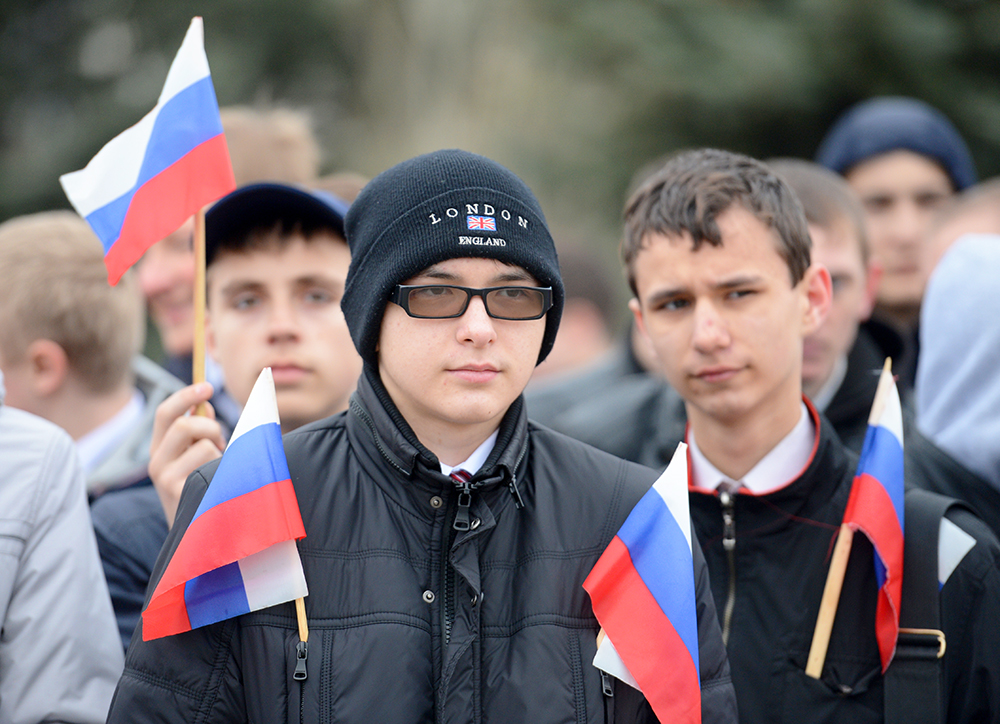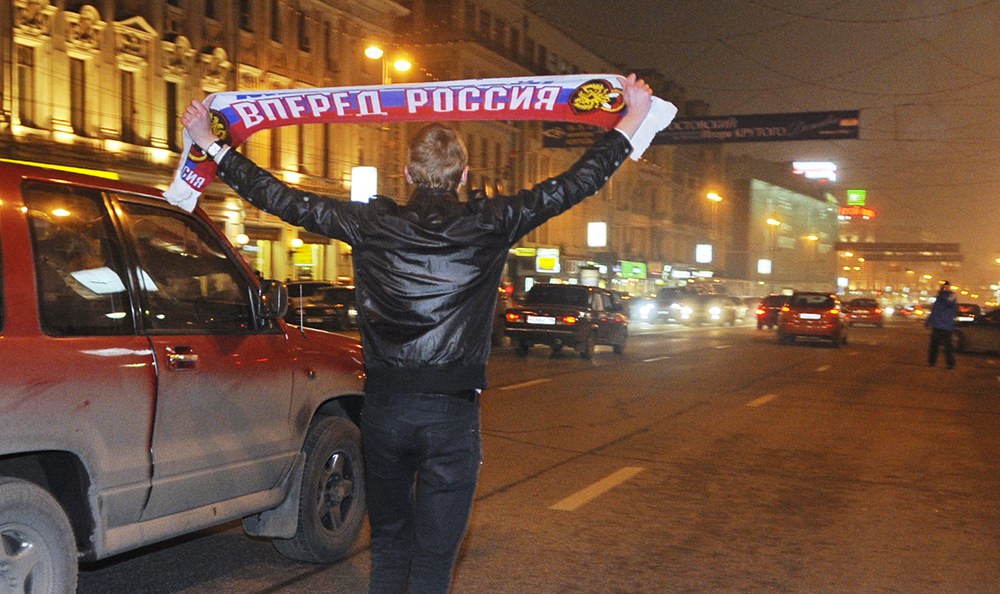 Раньше всё как-то импортные символы носили, своего стеснялись. А сейчас посмотрите хотя бы на футбольных болельщиков: все щёки в цветных полосах!