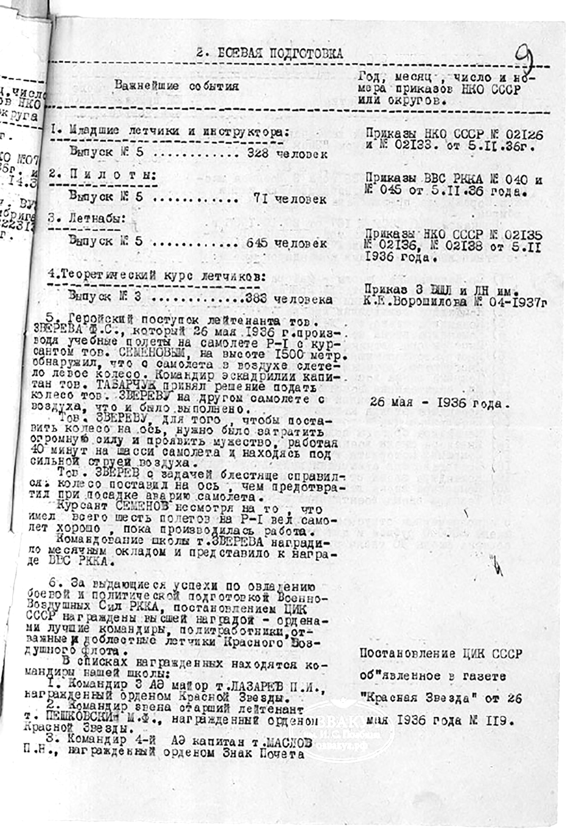 Инструктор лейтенант тов. Зверев после десятидневной болезни малярией изменился на вид – похудел, но по-прежнему весел, отзывчив. Он дышит молодостью. Он прекрасный физкультурник. Ему всего 23 года, а он уже обучает четвёртый выпуск курсантов. Учит он только на отлично и хорошо. Сегодня он первым сажает в кабину тов. Семёнова. Взлетают. Курсант Семёнов делает на Р-1 шестой полёт. Он хороший кандидат в члены ВКП(б), редактор красноармейской газеты подразделения.