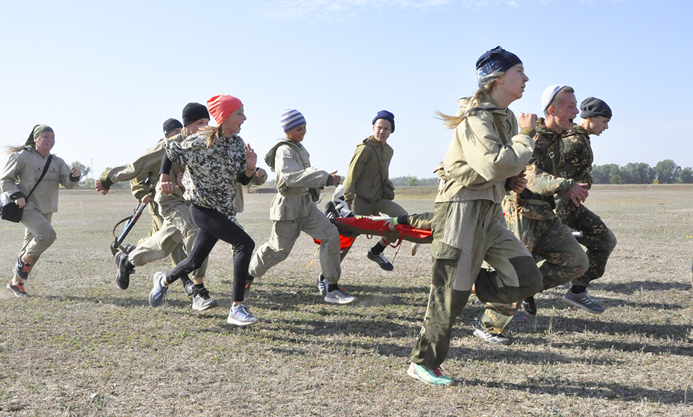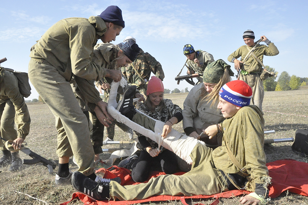 Отделение юнармейцев в алых беретах разворачивается цепью и, вместо того чтобы проползти положенные 50 метров по-пластунски, сразу устремляется в атаку.