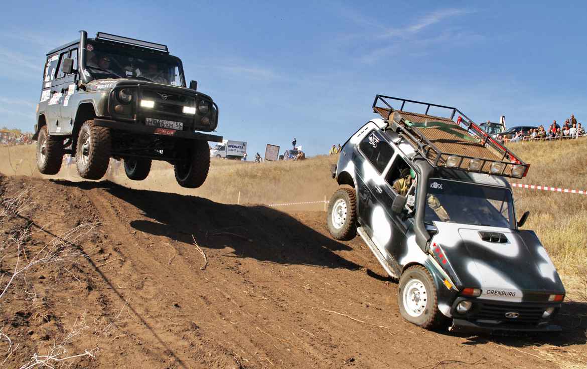 По сигналу одна за другой на трассу уходят пары машин. Подпрыгивая на ухабах и ныряя в рытвины, УАЗы-«козлики» стараются обогнать более юркие «Нивы». Ревут моторы, летит земля из-под колёс на крутых подъёмах.