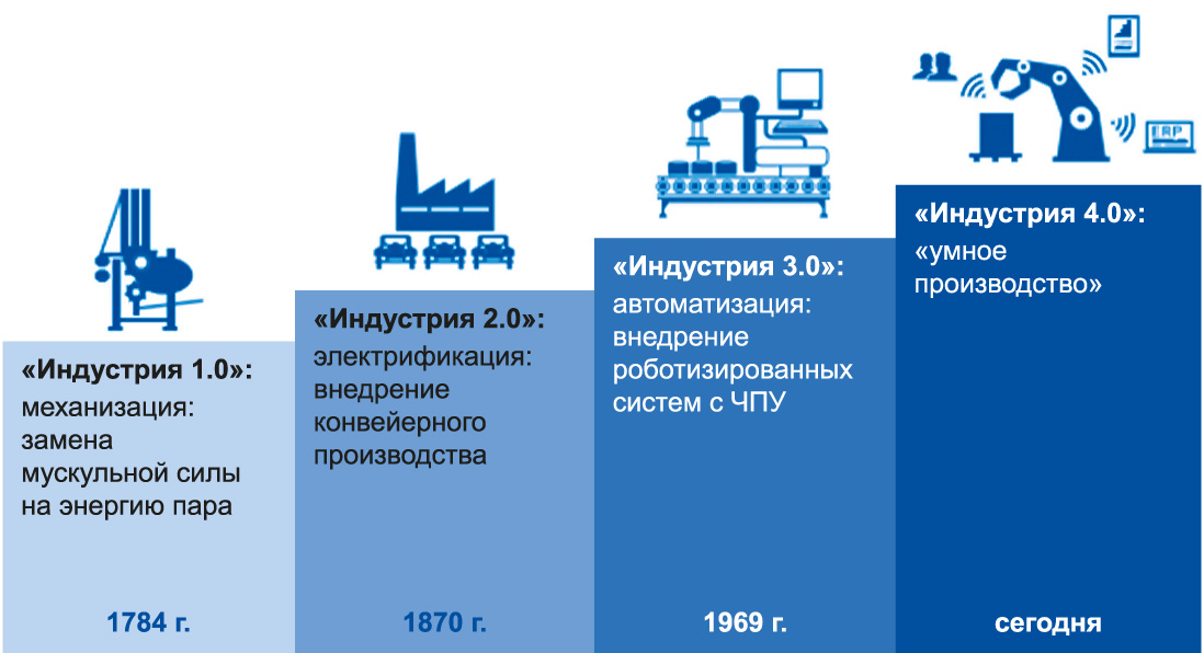 «Индустрия 4.0» получила своё название в 2011 году в Германии. Крупнейшие бизнесмены, политики и учёные говорили о повышении конкурентоспособности средств технологической перенастройки всех процессов через усиленную интеграцию «киберфизических систем», автоматизацию всех процессов и управление через Интернет. Промышленности это выгодно. Вес некоторых объёмов физических данных заменяется информацией, исчезает понятие добавленного времени, сокращаются производственные площади, необходимость долгосрочного складского хранения, затраты на человеческий труд. На рынок товар или компания выводятся с помощью цифровых коммуникаций на 50 процентов быстрее. И перспективы эти осознаёт весь мир. Россия в том числе.