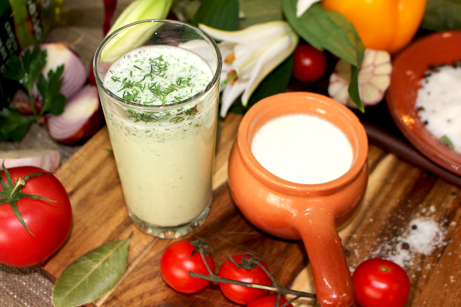 Простоквашу смешать с водой. Добавить мелко нарубленный укроп, соль, пропущенный через пресс чеснок. Размешать. Добавить соду, чтобы напиток приобрёл шипучесть.