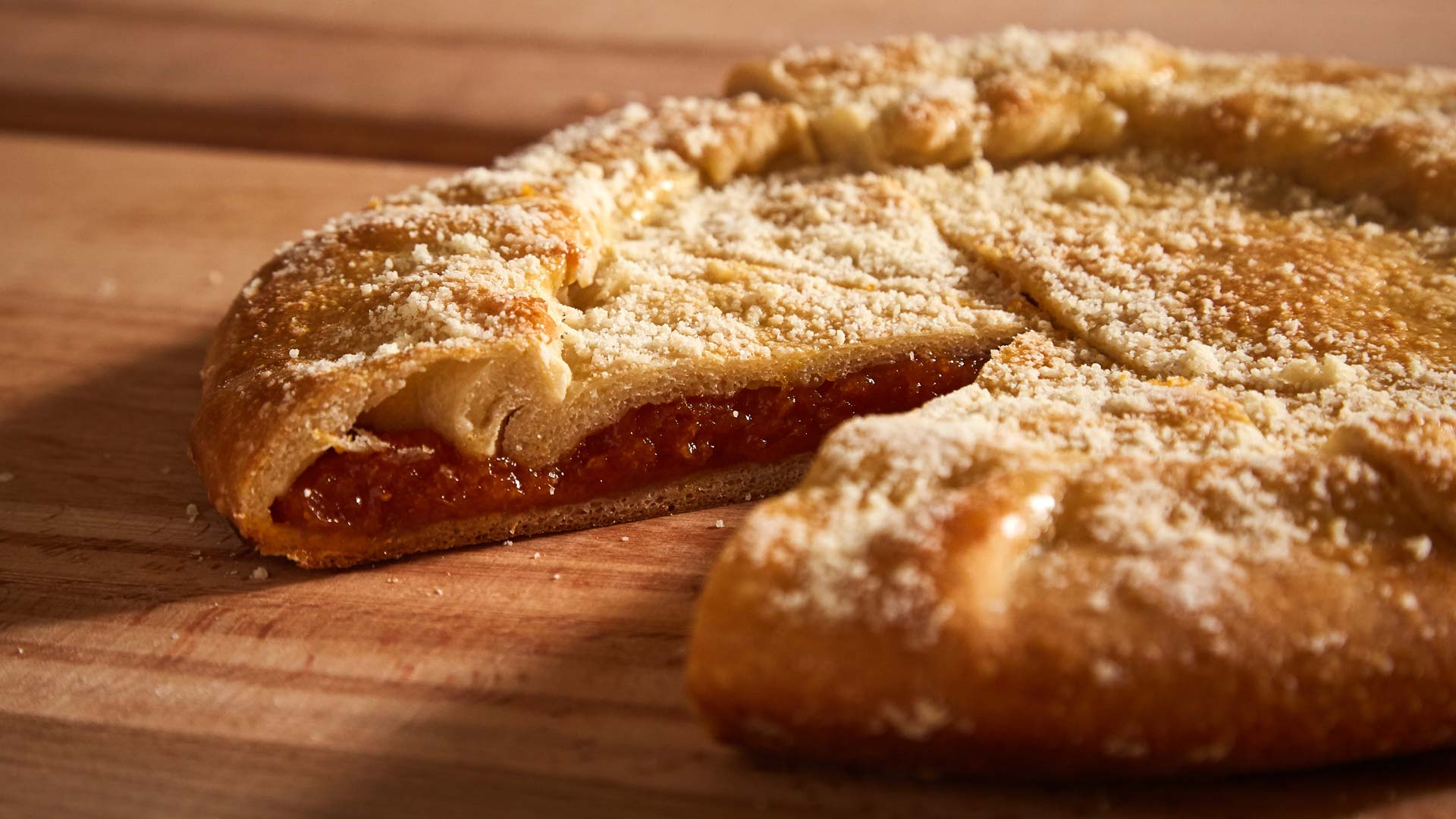 На тесто выложить начинку, затем – верхнюю часть теста. Края соединить. В центре сделать дырочку для выхода пара. Пирог смазать смесью из яйца и молока. Накрошить посыпку. Выпекать 40 минут при 170 градусах.