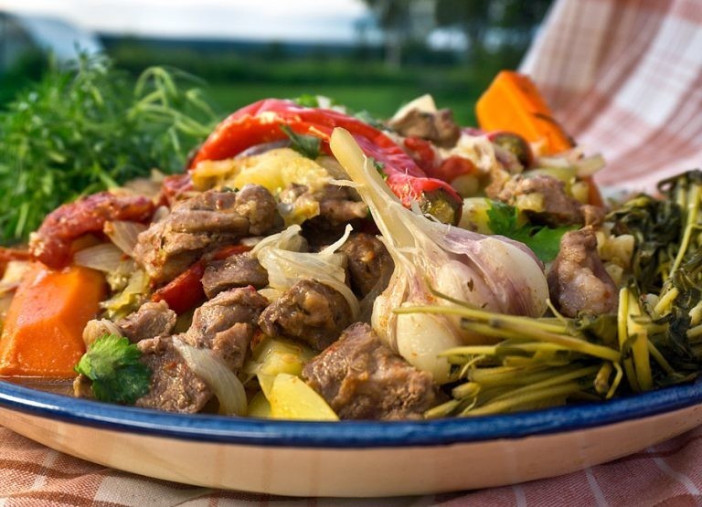 В казан уложить нарезанное на средние кусочки мясо. Сверху выложить лук, нарезанный кольцами. Посолить и поперчить. Затем – крупно нарезанные помидоры, баклажан, кабачки и капусту. Каждый слой посолить и поперчить. Закрыть крышкой. Довести до кипения. Убавить огонь. Положить лаврушку и кориандр. Томить под закрытой крышкой на маленьком огне больше часа.