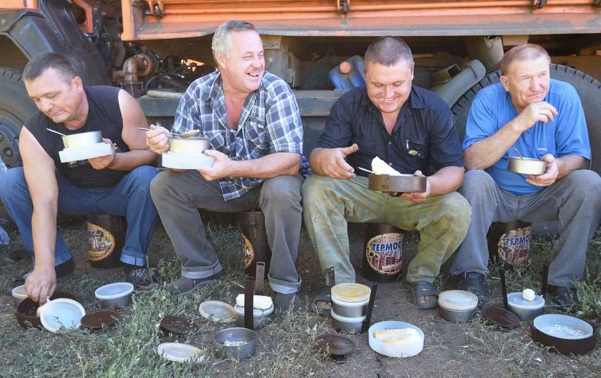 Хотя почему-то именно сейчас я вспоминаю нагретый, как кабина трактора, летний полдень и пшеницу, комбайнеров и водителей, так стесняющихся фотоаппарата. (Сколько раз я бегал за ними по полям, а они скрывались от меня, как партизаны!) И простая еда на полевом стане из многоэтажных жестянок термосов. Самая вкусная.