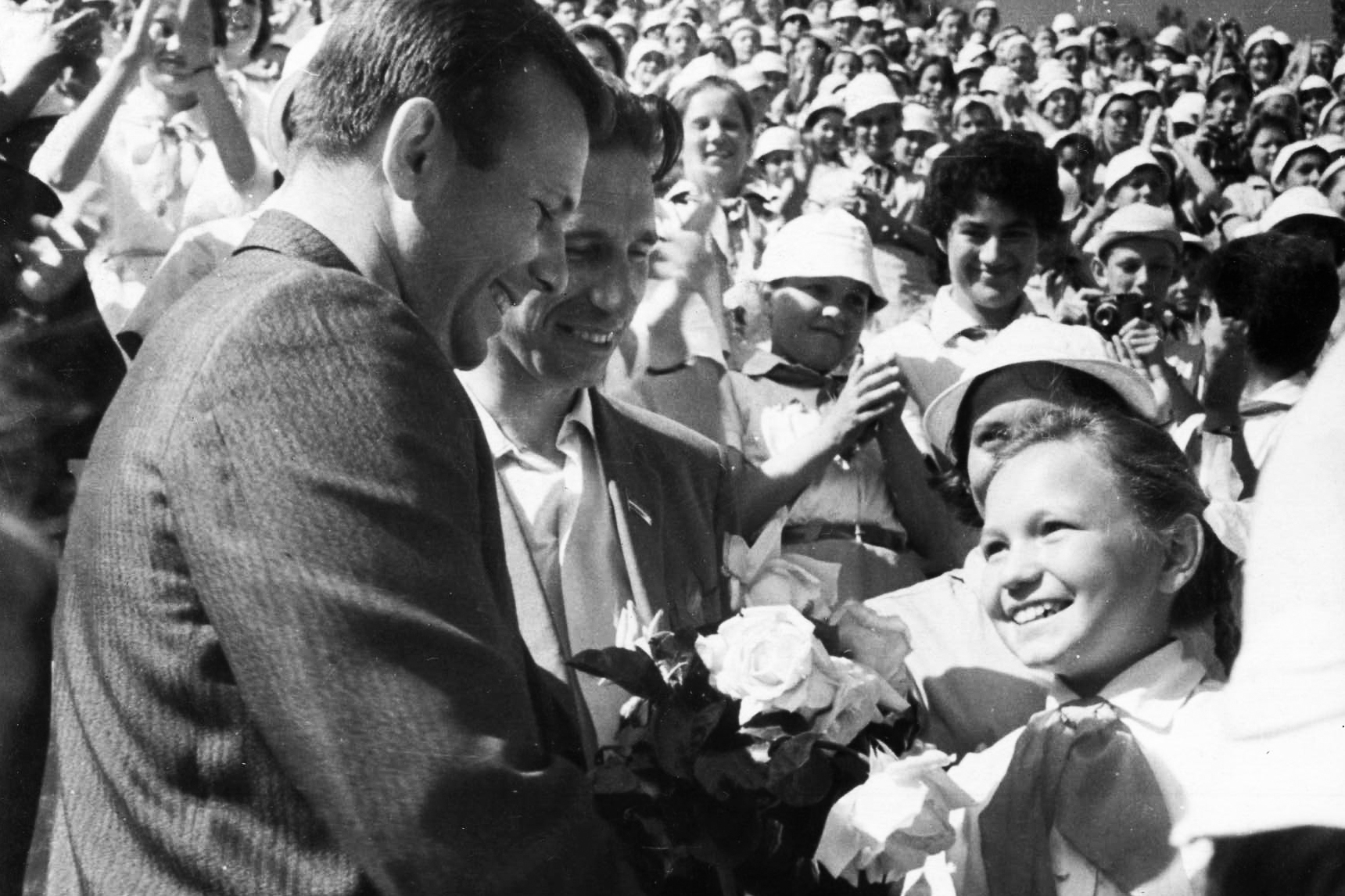 На трибуне стадиона Гагарин, его просили снять тёмные очки, но он так и не снял. По его левую руку заместитель начальника «Артека». И старший пионервожатый Александр Зельцер. А справа от Гагарина приглашённый в «Артек» мальчишка из школы юных космонавтов при Оренбургском авиационном училище, может, кто-то знает его фамилию и дальнейшую судьбу?