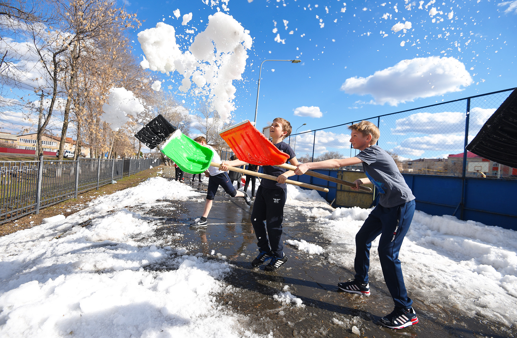 Мы проезжали мимо школы в Переволоцком и заметили, как девчонки с мальчишками убирают остатки горбатого снега рядом с футбольной площадкой. На улице стояли неуверенные и непривычные 20 градусов жары, и ребята работали почти в майках. Это же практически Альпы. Под ногами снег, сверху жарит солнце. Остановились поснимать, и выяснилось, что расчищают они беговую дорожку. И как-то у меня мгновенно сложилась по-детски яркая картинка скорого будущего. Так, наверно, случается, когда бываешь среди людей с незамутнённым сознанием.