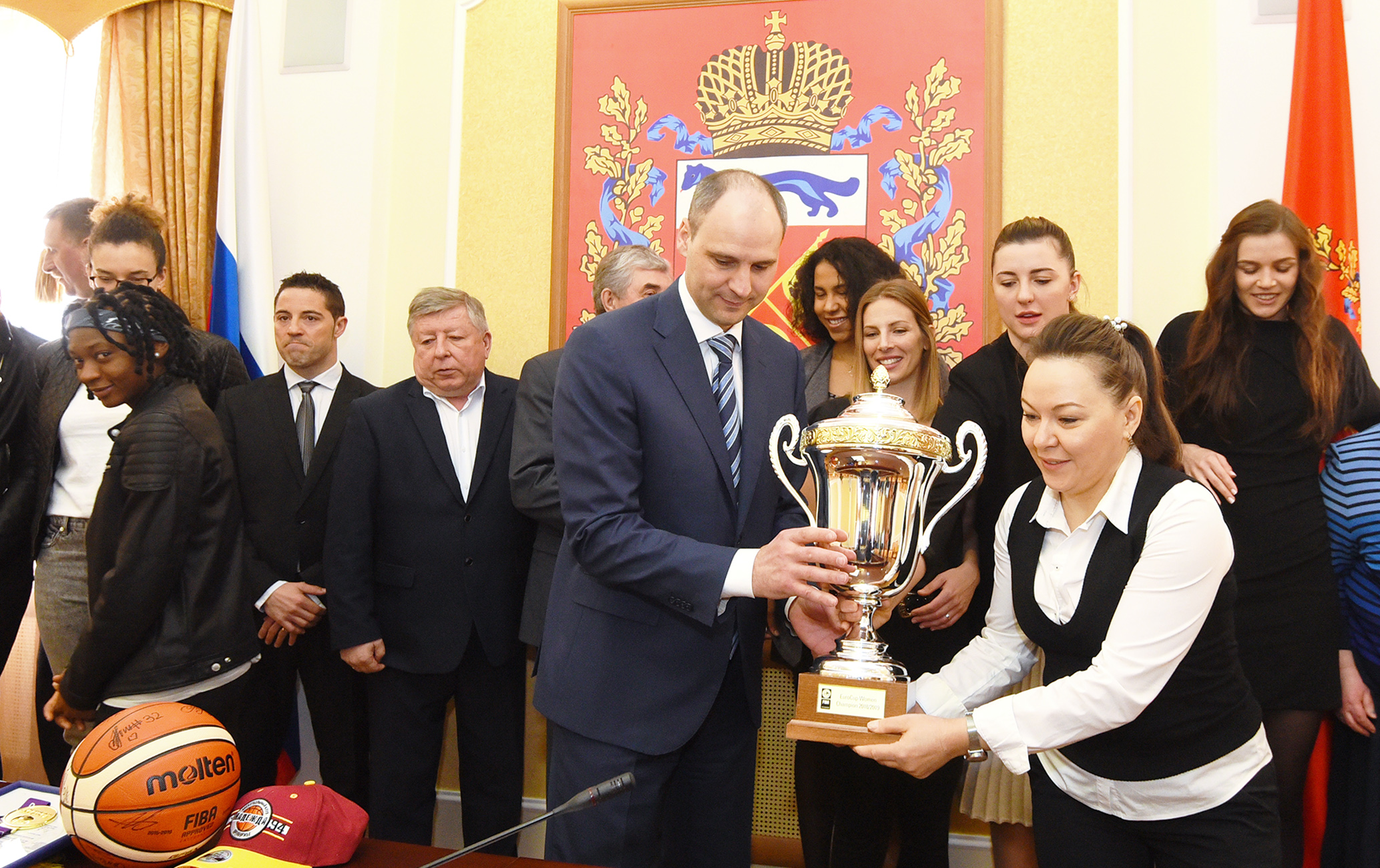 Так врио губернатора Денис Паслер обратился к женской баскетбольной команде «Надежда», которая выиграла и привезла Кубок Европы.