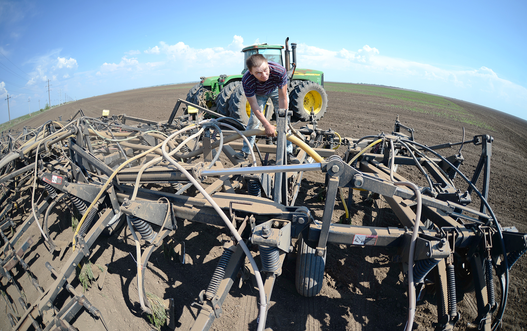 Могучий восьмиколёсный «Джон Дир» быстро приближается к кромке поля, делает разворот. За собой трактор тянет автоматическую сеялку, бункер для зерна, прикаточные валки. Механизатор спускается по лесенке, чтобы проверить настройку агрегата.