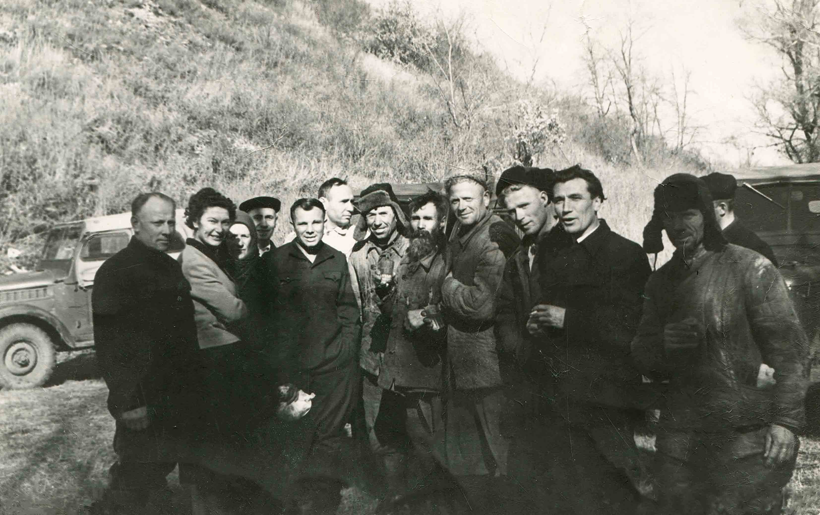 Рядом с Гагариным в ушанке со спущенными ушами Василий Переплётчиков, фронтовик, бригадир рыболовецкой бригады из Архиповки, который, по словам селькора, любил вспоминать тот день: