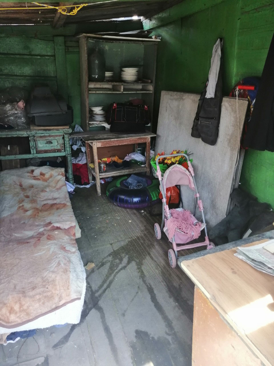 Если б здесь не увидели людей, можно было подумать, что квартира нежилая. На стенах редкие клочки обоев, ходить по деревянному полу без обуви невозможно. Рядом с четырьмя мешками, наполненными бытовыми отходами, валяется грязное бельё. Молодая мамаша Вика оправдывается, что стирать руками не успевает.