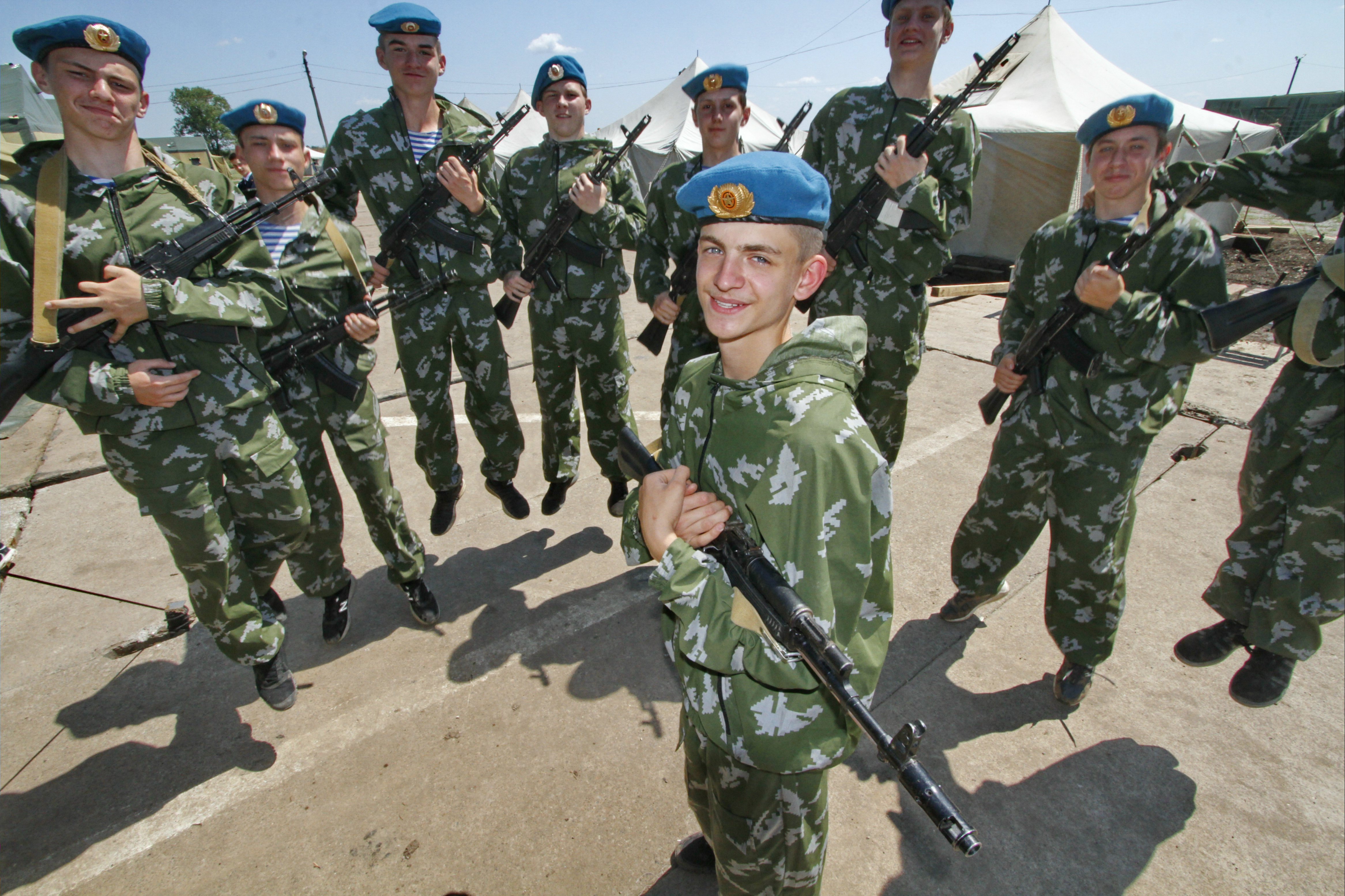 Вместе с товарищами он отрабатывает действия взвода, поднятого по тревоге. В руках у ребят макеты автоматов, которые не отличишь от настоящих. Разбирают и собирают их мальчишки за считанные секунды. Знакомы и с приёмами рукопашного боя.
