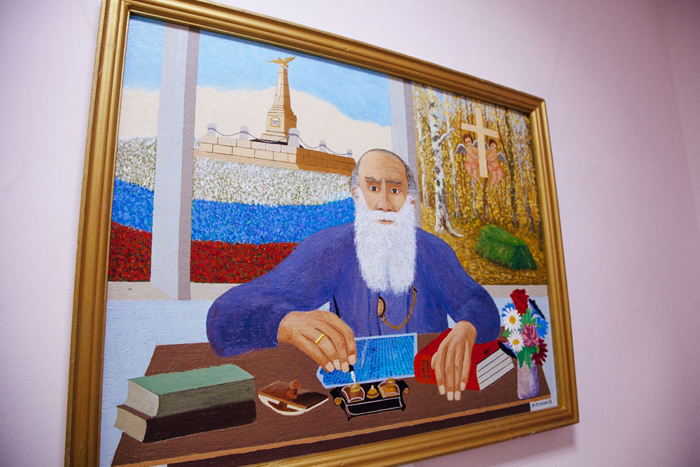 Выставку картин дополняет подборка книг, посвященная Льву Толстому.