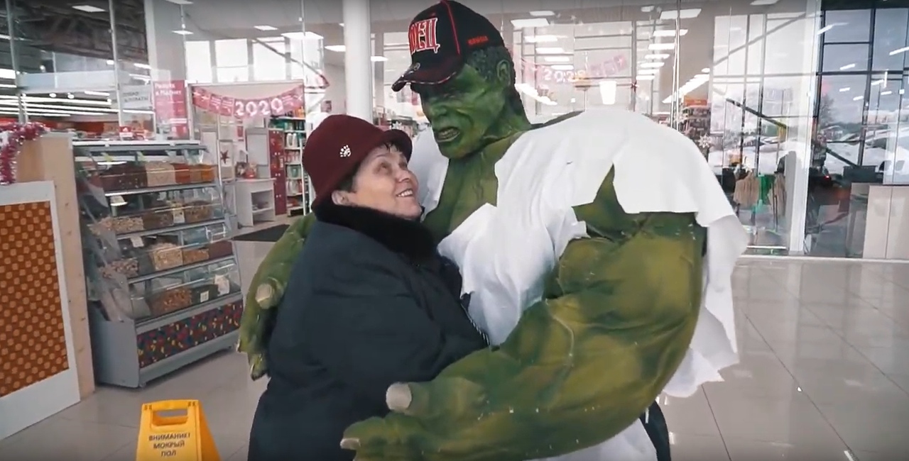 В одном из торговых центров в пригороде Оренбурга покупателей заключает в объятия герой комиксов Халк. Самый сильный герой Вселенной Marvel не только показывает свою мощь, но проявляет галантность и доброту.